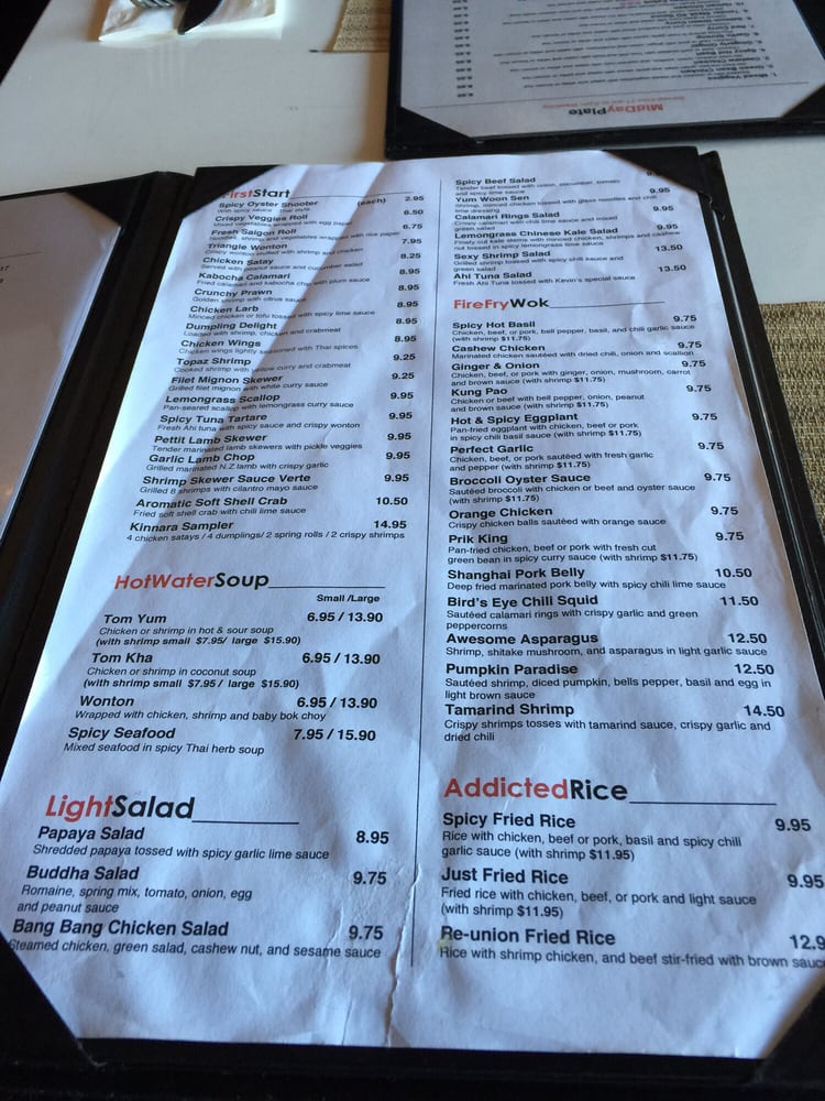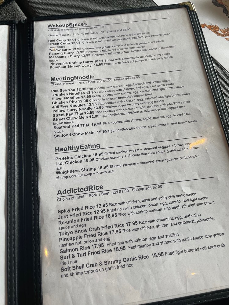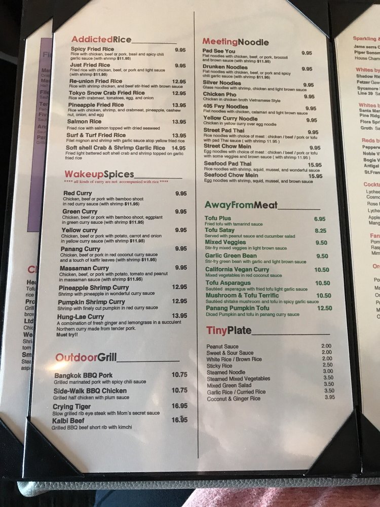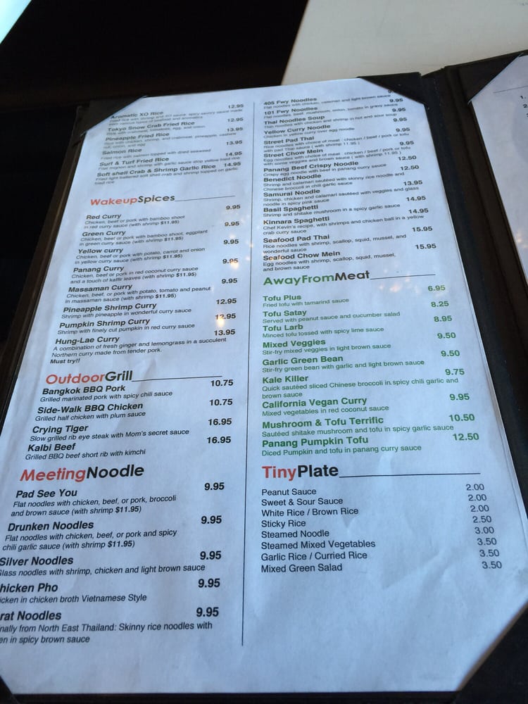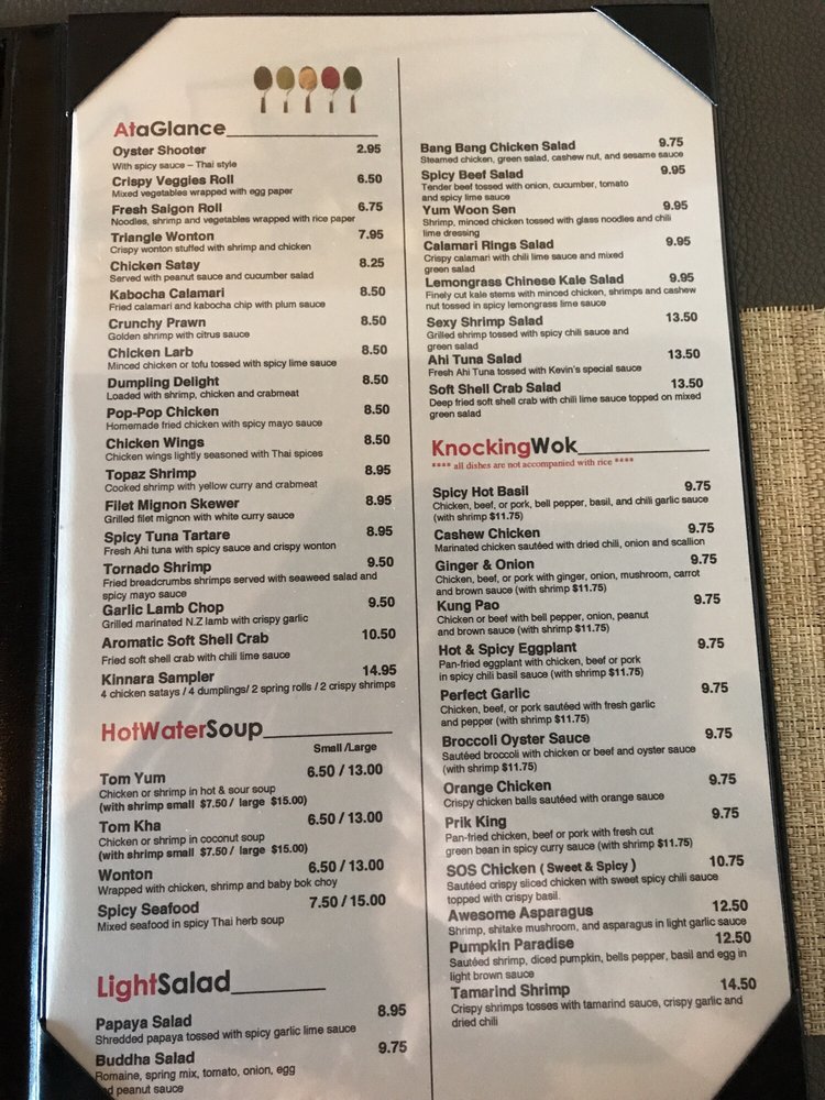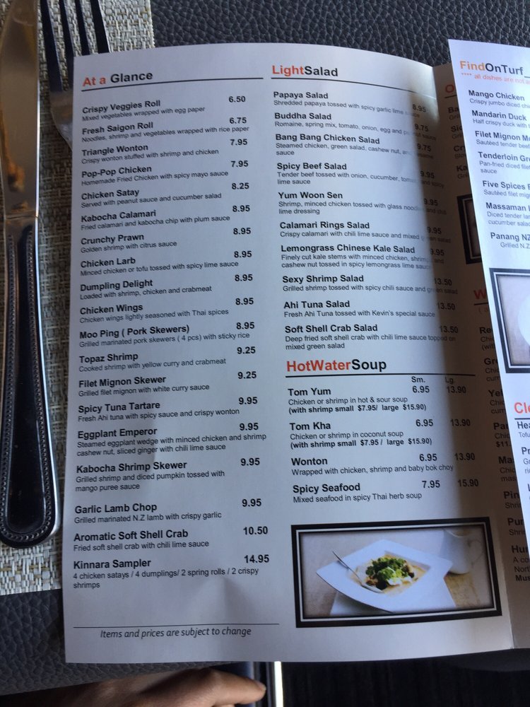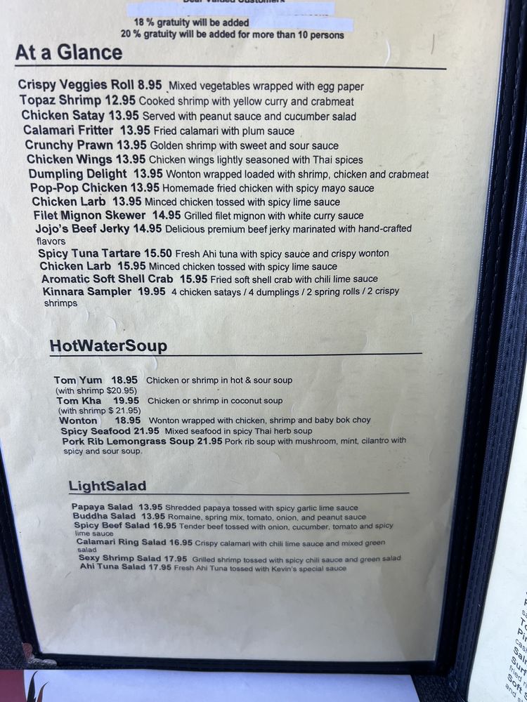 Introducing the menu at Kinnara Thai, located in Van Nuys, CA. This trendy and classy restaurant offers a wide range of Thai dishes with options for vegetarians and vegans. From their Kinnara Sampler to the Spicy Tuna Tartare and Chicken Larb, every dish is packed with flavorful ingredients. The Hot Water Soup selection includes Tom Yum and Coconut soups with your choice of protein. Indulge in the light salads like Sexy Shrimp Salad and Papaya Salad for a refreshing experience. Customers praise the delicious food, attentive service, and beautiful ambiance of the restaurant. Whether you're craving Thai curry, seafood, or noodle dishes, Kinnara Thai is a must-visit spot for authentic and mouthwatering Thai cuisine.